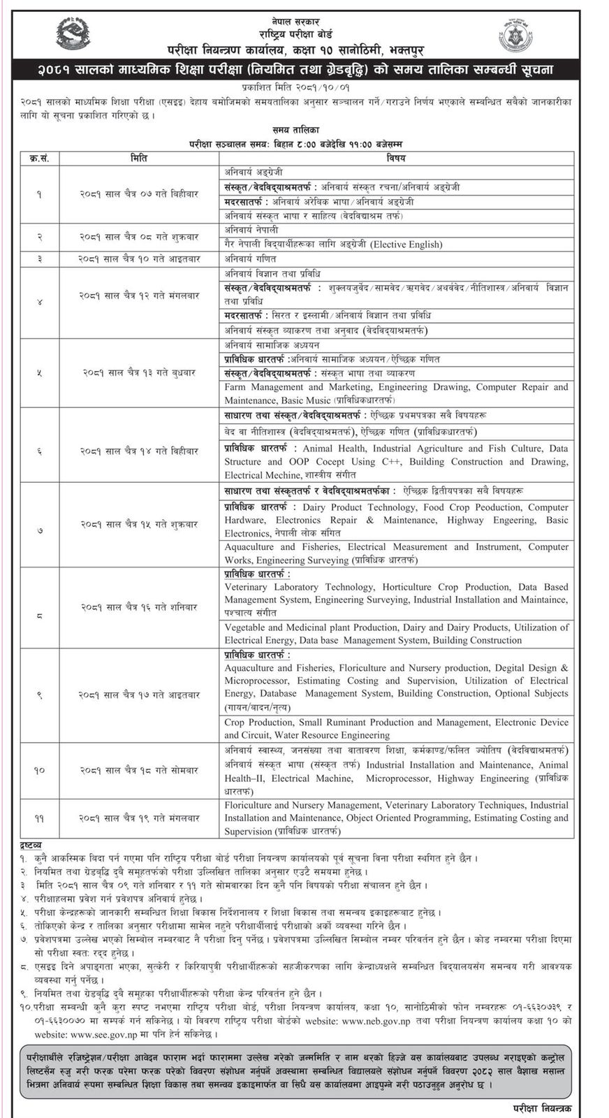 बाेर्डले जारी गरेकाे सूचनाअनुसार चैत ७ गते सुरु हुने परीक्षा १९ गतेसम्म सञ्चालन हुनेछ । परीक्षा तालिकाअनुसार पहिलो दिन चैत ७ गते अनिवार्य अंग्रेजी, ८ गते अनिवार्य नेपाली, चैत १० गते अनिवार्य गणित, १२ गते अनिवार्य विज्ञान विषयको परीक्षा हुनेछ ।